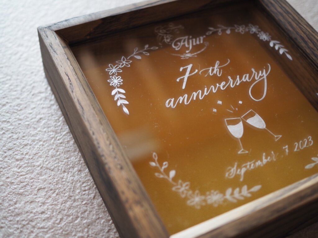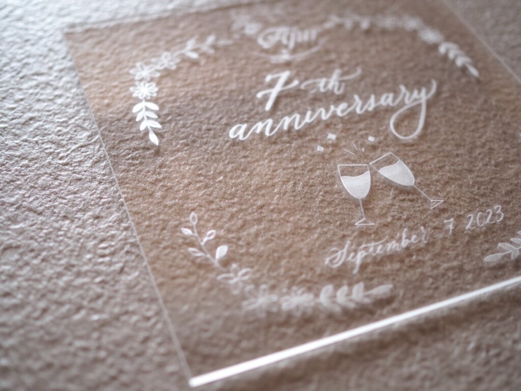 7th anniversary と日付はカリグラフィーで手書きした文字を刻印しています。